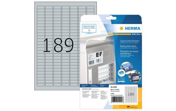 Herma Typenschild-Etiketten 4220 25 x 10 4725 Etiketten, A4, 25 Blatt, silber