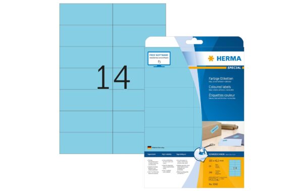 HERMA Universal-Etiketten 10.5 x 4.23 cm, 280 Etiketten, Blau Klebehaftung: Selbstklebend, Ablösbar, Drucker Kompatibilität: Laser, Inkjet, Anzahl Blatt: 20 ×, Papierformat: A4, Anzahl Etiketten: 280, Etikettengrösse: 105 x 42.3 mm