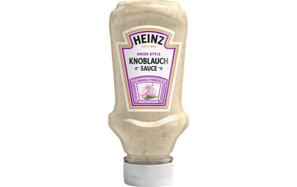 Heinz Sauce Knoblauch 220 g Produkttyp: Grill-Saucen, Nährwertangabe pro: 100 g, Energiegehalt (in kj): 1526 KJ, Energiegehalt (in kcal): 364 Kcal, Fett: 35 g, Gesättigte Fettsäuren: 2.9 g