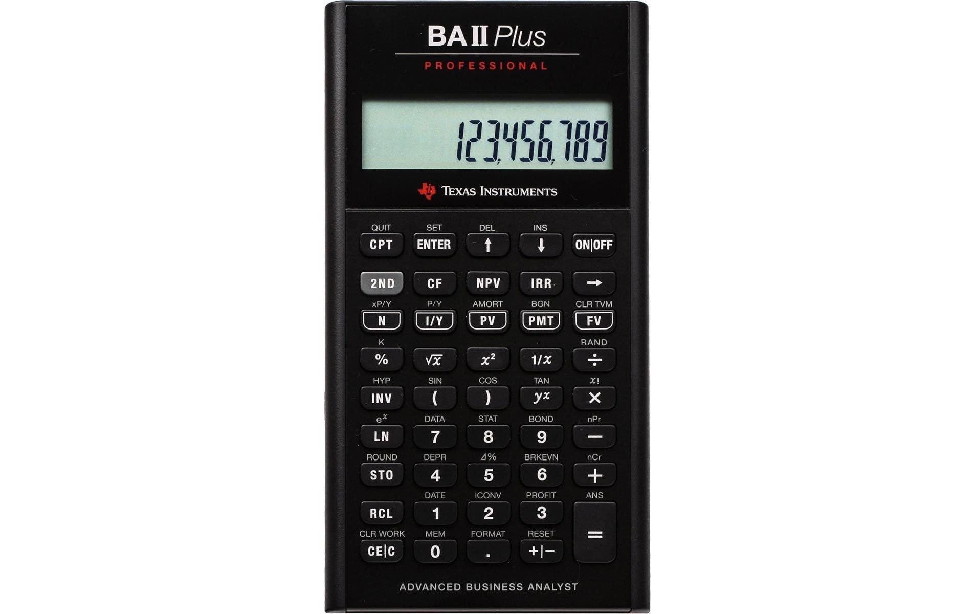 Texas Instruments Finanzrechner BAII Plus Prof Stromversorgung: Batteriebetrieb, Typ: Finanzrechner, Detailfarbe: Schwarz, Displaytyp: LCD, Anzahl Zeilen: 1 ×, Anzahl Stellen: 10 ×